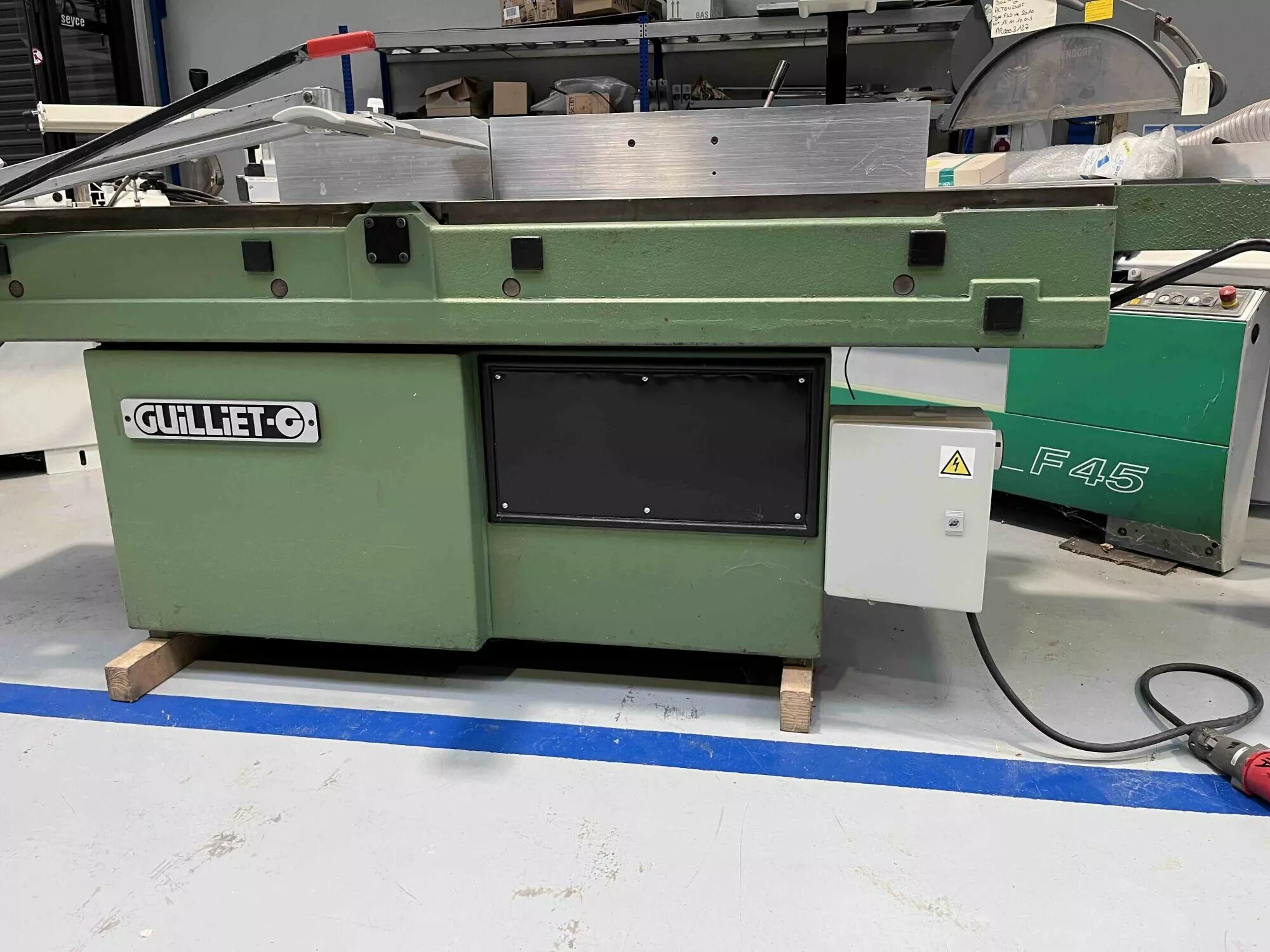 Dégauchisseuse Guillet CKX de 1985, équipée d’une potence et d’un frein électronique pour une sécurité optimale. Tables de 2700 mm (1500 mm entrée, 1200 mm sortie) et moteur triphasé 4kW. Idéale pour un dégauchissage précis dans les ateliers professionnels.