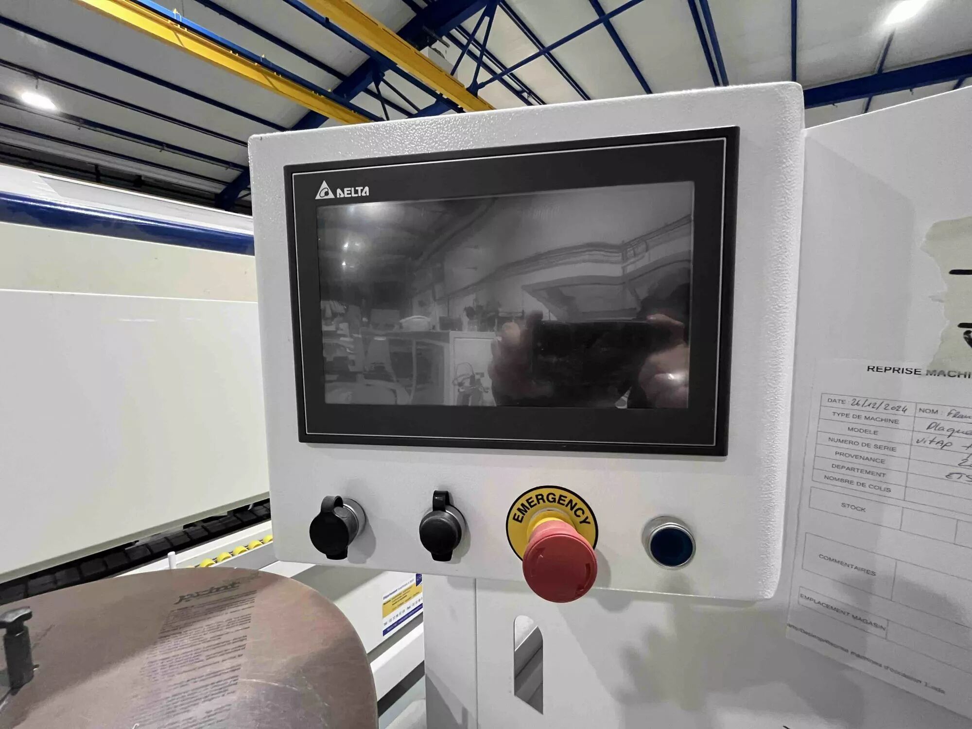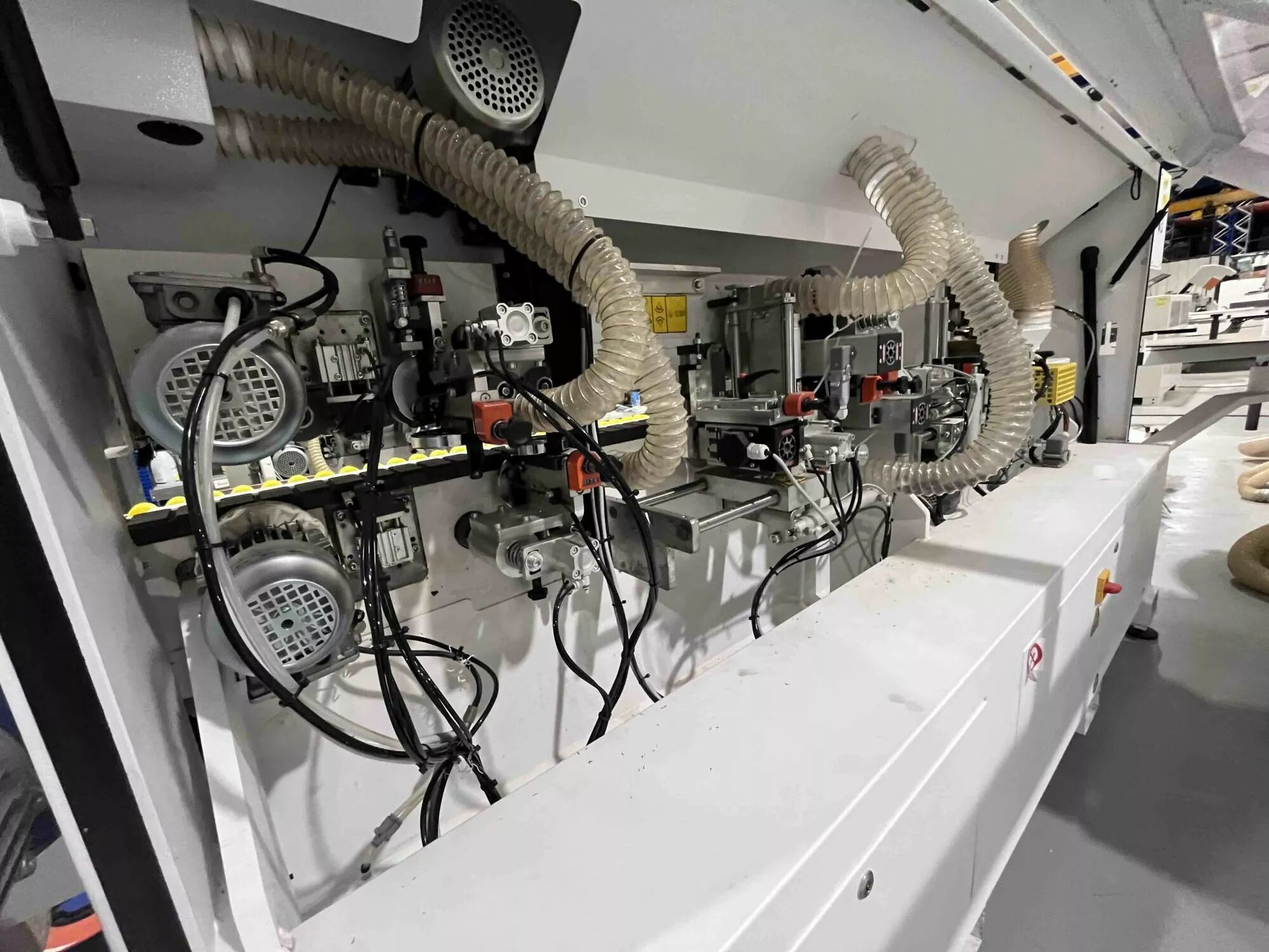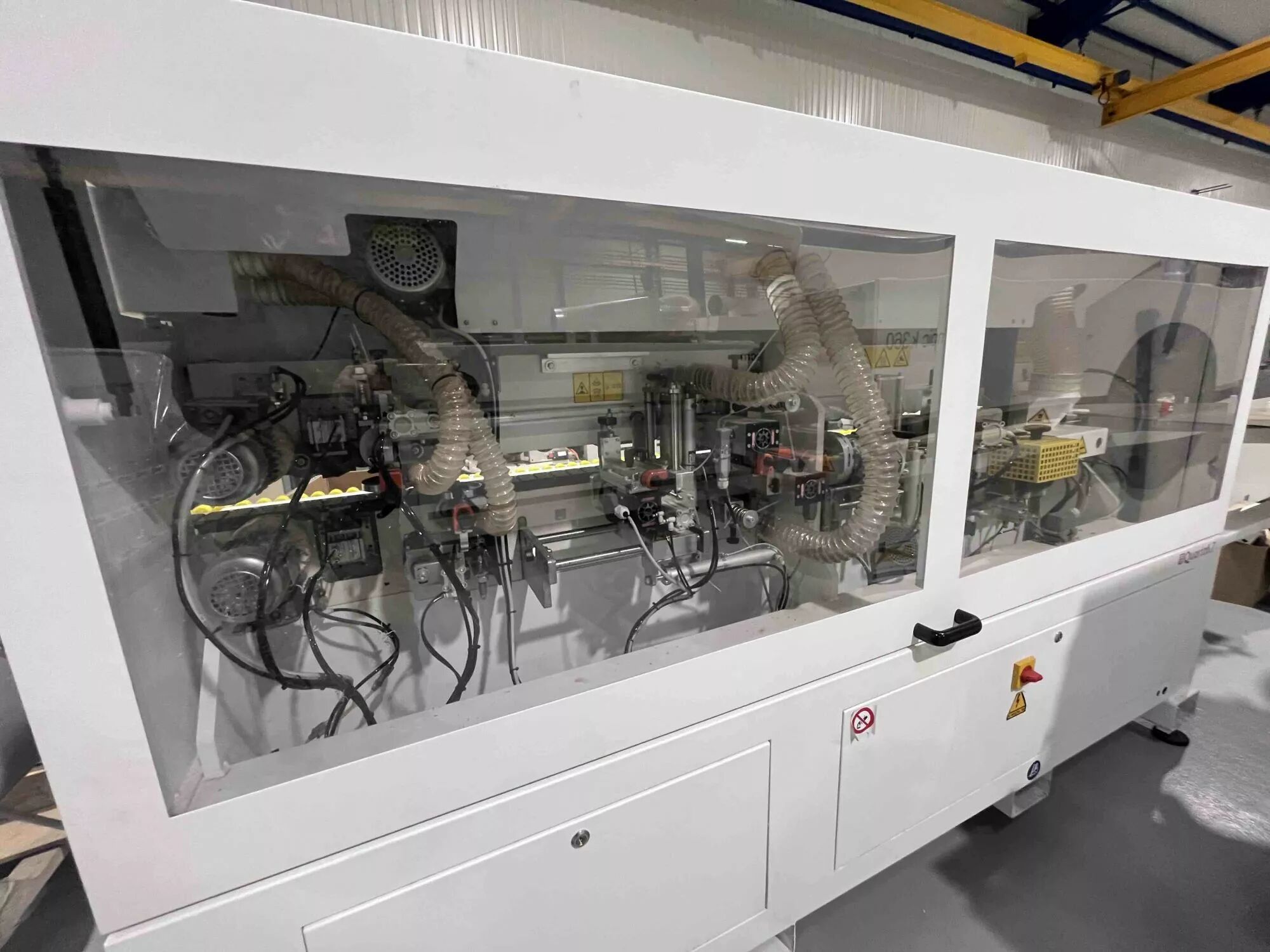 *La machine est en version CE, automatique, à commande électronique, avec avance continue dans la machine, agrégat de coupe en bout, agrégat d'affleurage, agrégat de ponçage de chants.