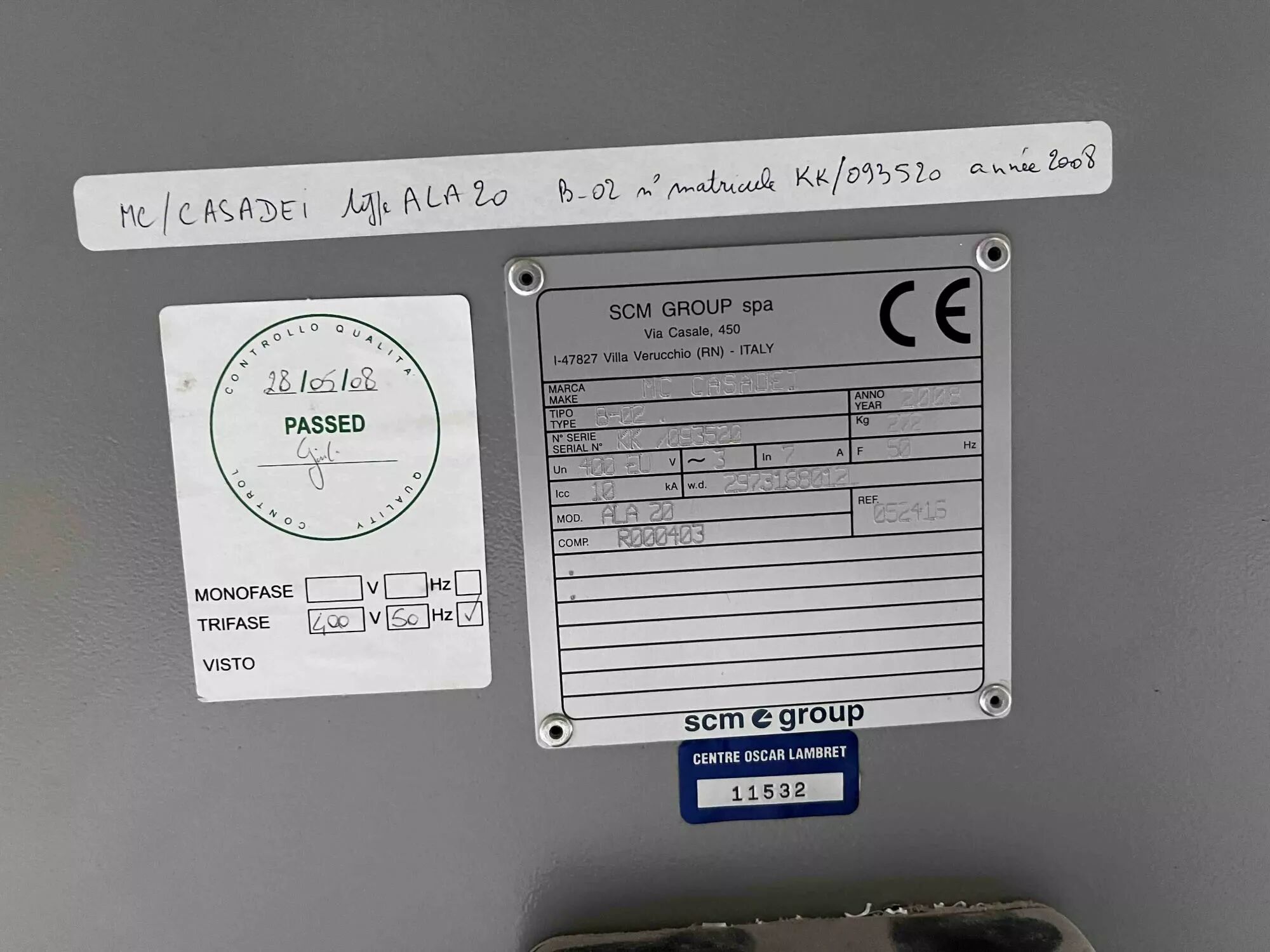 Accueil > Machines à bois d'occasion > Plaqueuse de chants (automatique ou à commande numérique) > PLAQUEUSE DE CHANTS CASADEI TYPE ALA 20 N°S KK/093520 ANNEE 2008